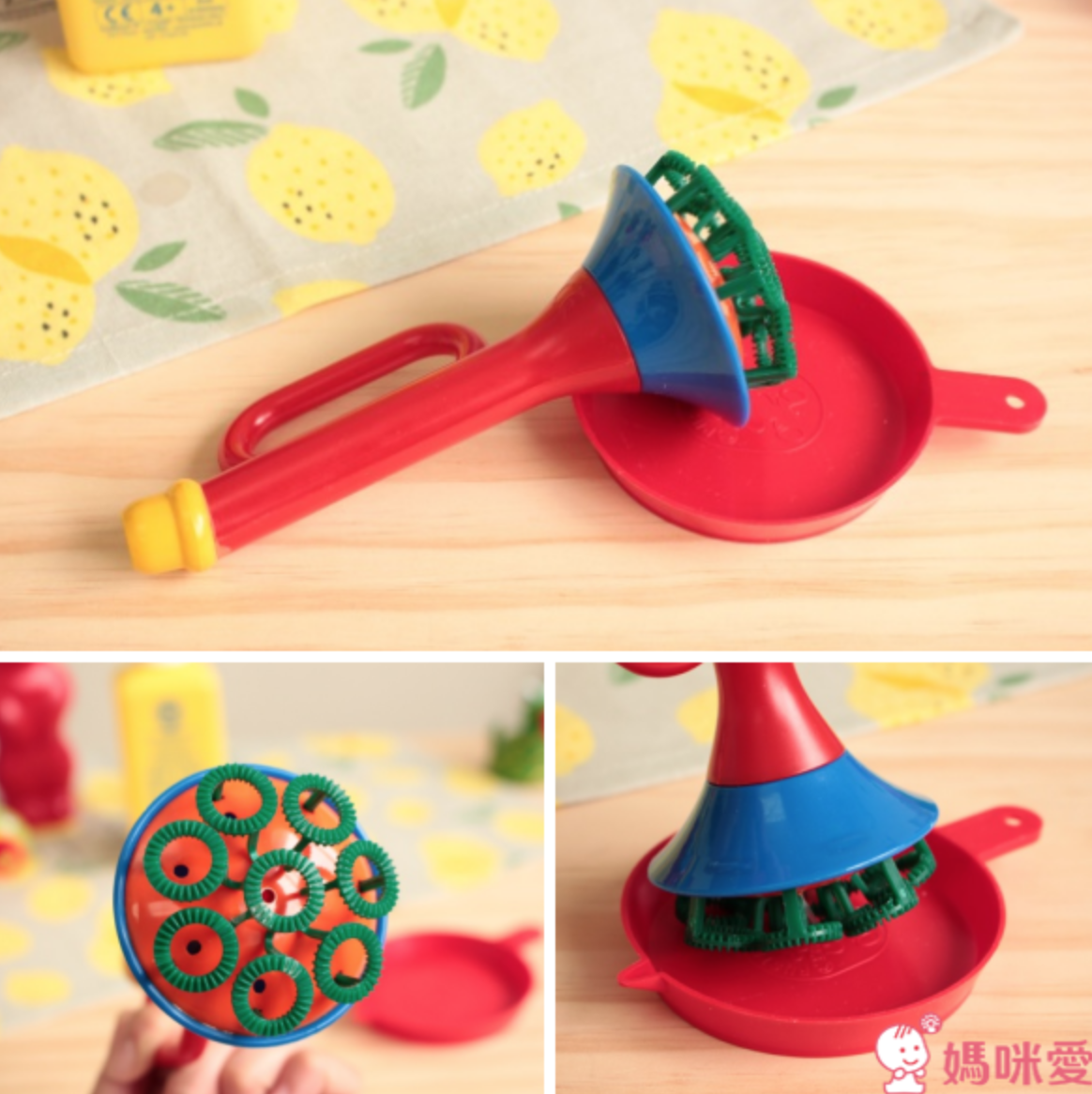 喇叭開口處上有很多洞洞,一次可以吹很多顆泡泡,是許多小朋友最喜歡的款式~將泡泡水倒在小盤上更好沾取喔