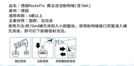 內容物:泡泡動物槍(隨機出貨)、泡泡水(70ml)
