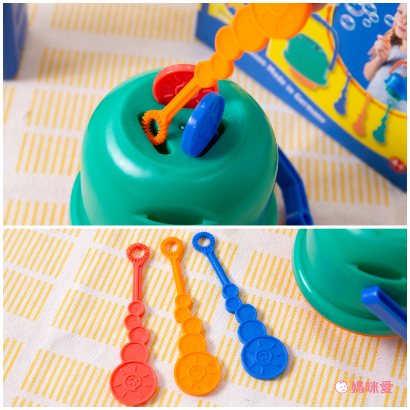 一共有三根不同顏色的泡泡環,兩個孩子一人一支不吵架,吹泡泡再也不用「輪流玩」啦~