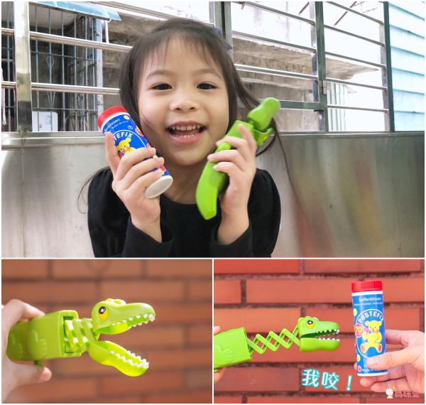 一收到這個鱷魚泡泡~薇薇已經迫不及待要出去玩啦!!它的概念很簡單,Pustefix 經典的無毒泡泡液+加上超可愛的鱷魚夾,準備張大嘴巴夾泡泡吧~♫