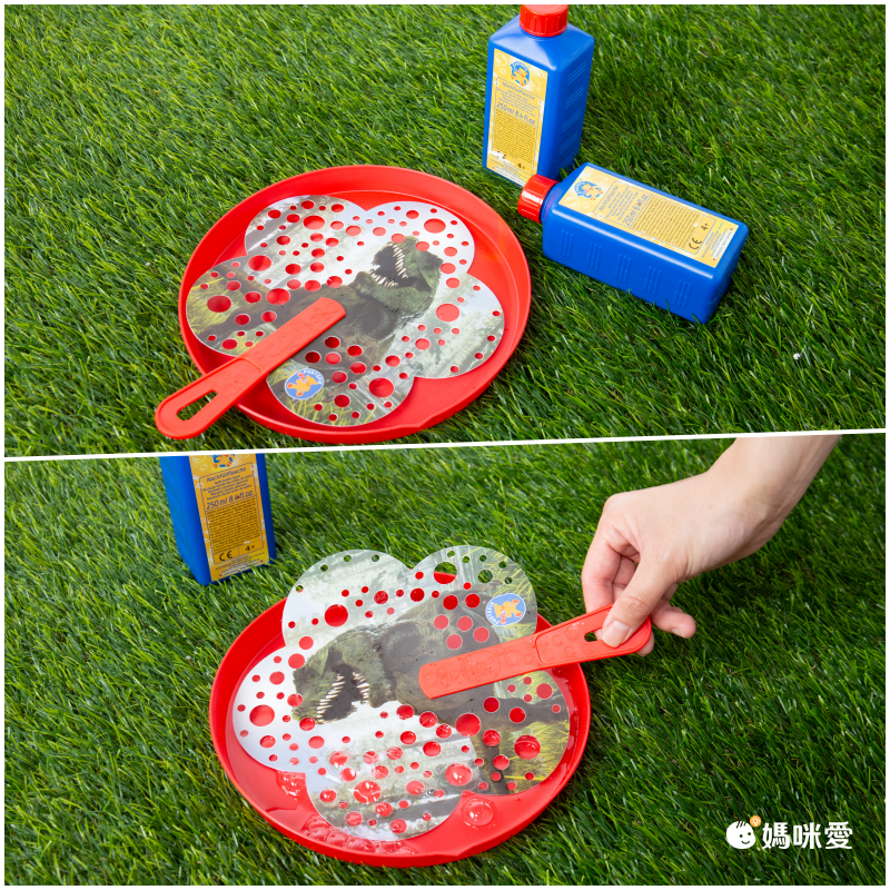 一個吹泡泡、一個夾泡泡,造型可愛又很好玩~邊玩還可以訓練反應能力呢!我必須說,這可不是什麼公主優雅的抓泡泡那種比賽,是活動力十足的放電追逐競賽啊~因為泡泡碰了就破,當然不會乖乖停在鱷魚嘴巴裡,反倒興起二個孩子瘋狂地 “再來一次”(這就是媽媽我的目的啊!)