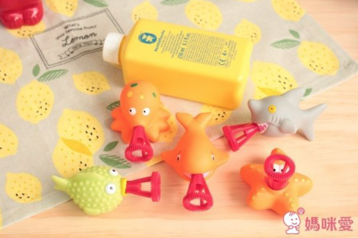 這款最好玩的地方是不用吹!用力把河豚按下去,他就會口吐白沫了哈哈,適合懶得吹、喜歡有連續泡泡的寶貝~