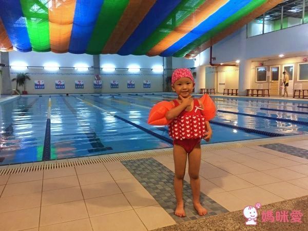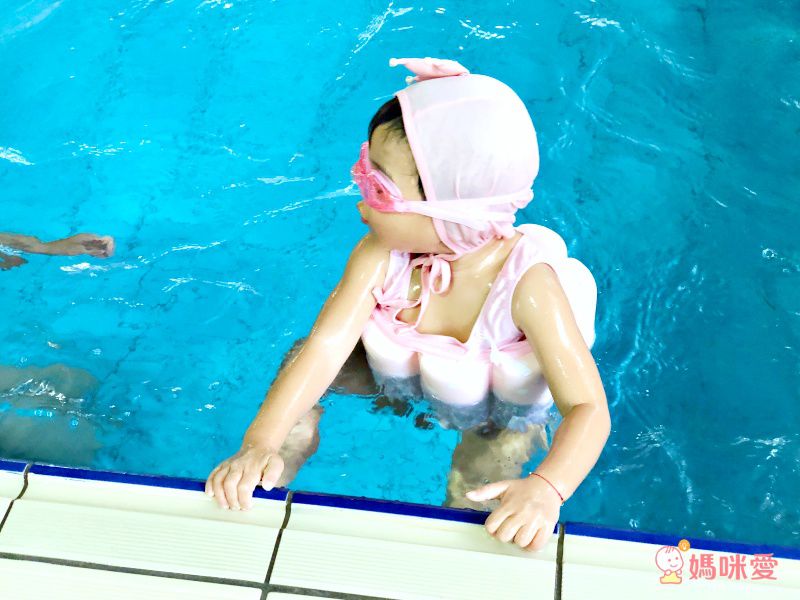 穿好浮力泳衣、帶著臂套,下水前先做一下暖身運動,再讓淞兒坐在池邊踢踢水熟悉水溫。