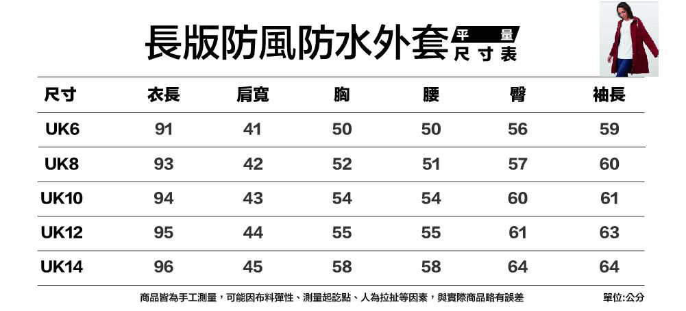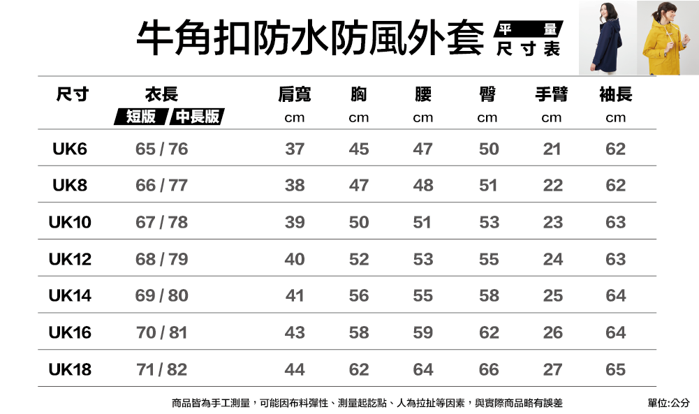 附上牛角扣防水防風外套尺寸表給媽媽參考