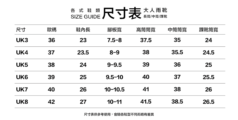 尺寸:UK3 (約23cm) UK4 (約23.5cm) UK5 (約24cm) UK6 (約25cm) UK7 (約26cm) UK8 (約27cm)