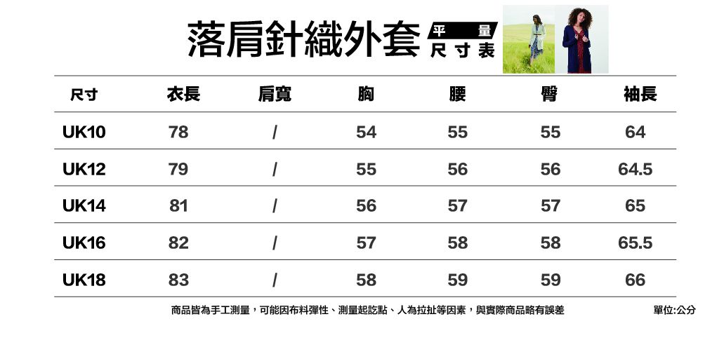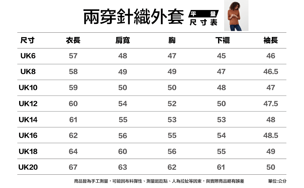附上厚針織外套尺寸表給媽媽參考