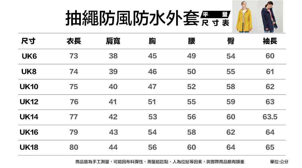 附上抽繩防水防風外套尺寸表給媽媽參考