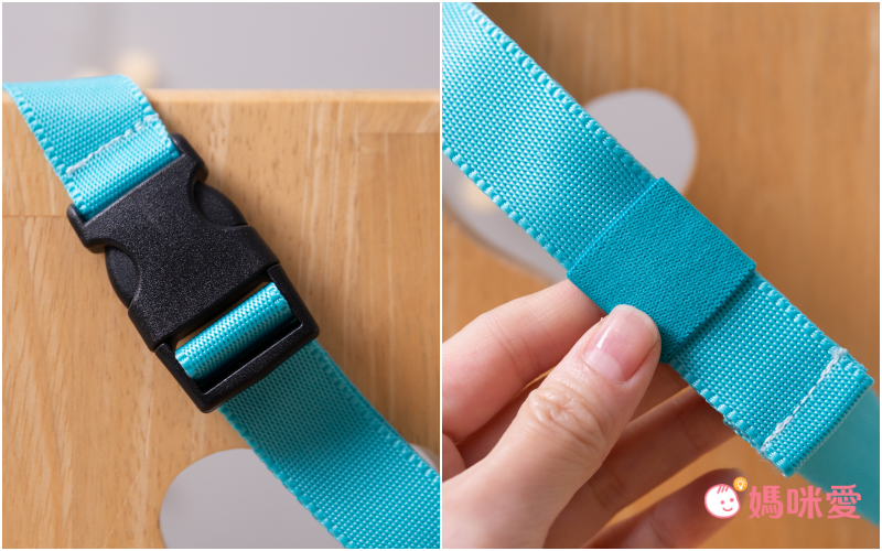 背帶的部分也細拍給媽咪們看,他是這種安全扣的設計,然後調整背帶長度的部分也是從這邊操作,收尾的部分是同色系的鬆緊帶,好可愛!