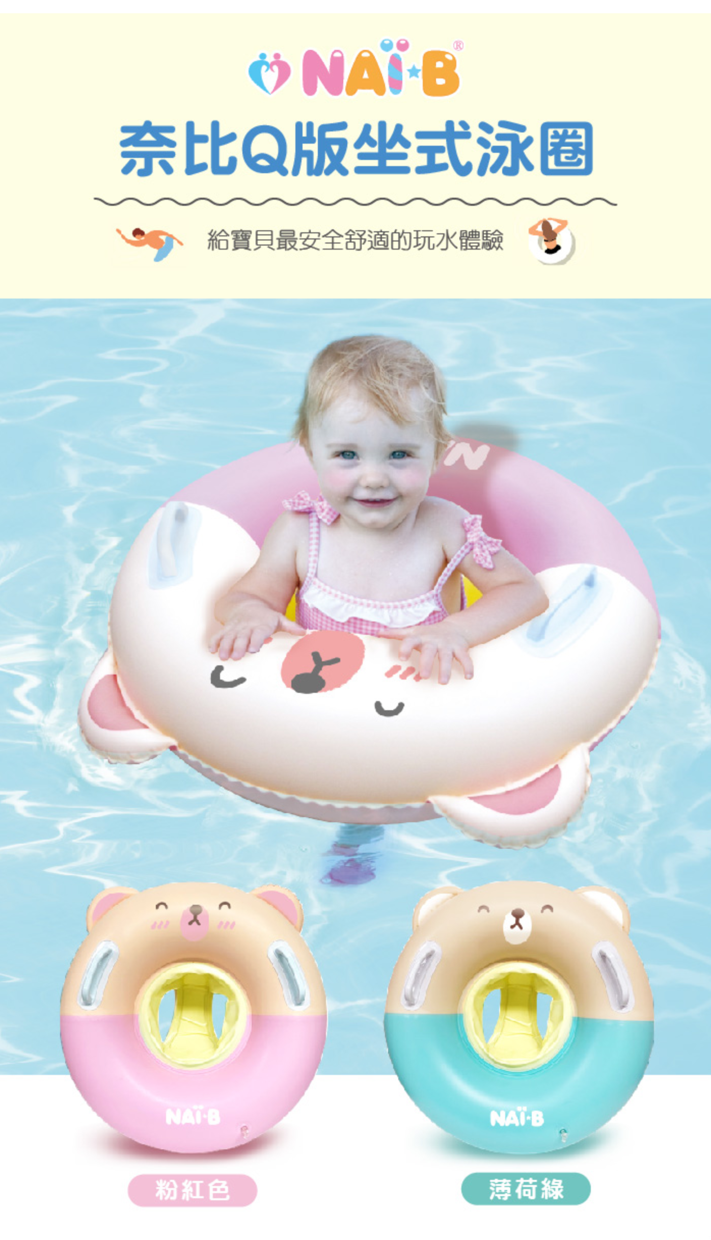 女寶可以選另一款粉紅色的泳圈~仍然需要再提醒大家一次,不管孩子們在水裡的狀況如何,都不要離孩子們太遠以策安全喔!