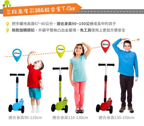 第一階段 67cm高,適合 90-110cm(實測 87cm 高的攸攸也 ok);第二階段 75cm 高,適合 110-130cm;第三階段 80cm 高,適合 130-150cm。