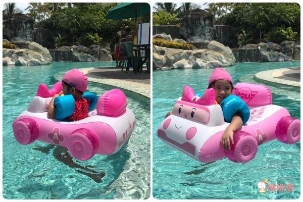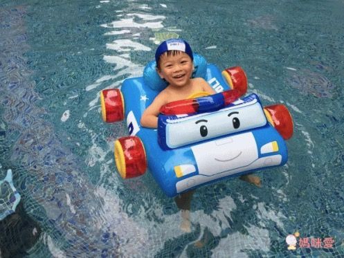 我還幫柚子準備了波力泳帽一起搭配,瞧柚子超開心的坐上他的波力汽車造型泳圈,他自己套上泳圈後,就馬上下水玩水了♡♡♡