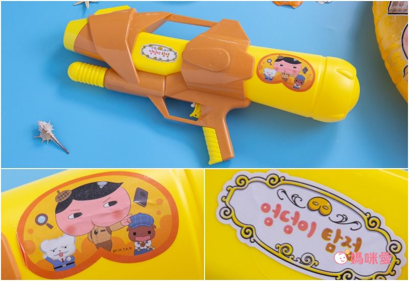 大砲式的酷炫水槍,上面有孩子最愛的偶像屁屁偵探圖案,連配色也很屁屁偵探風~很到位