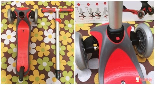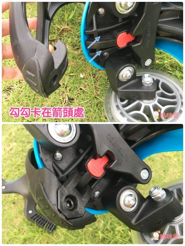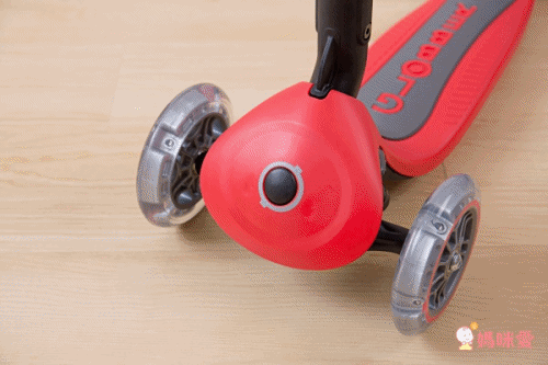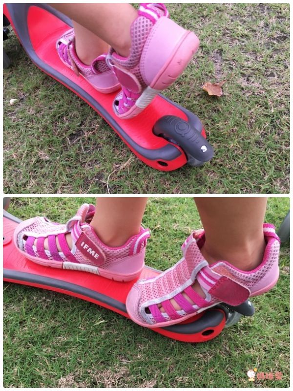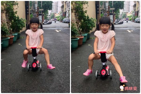 像牛牛剛開始玩滑板車,不會控制方向,因為沒有固定輪子,所以她不管怎麼溜,因為重心抓不到的關係,她總是偏向一邊,之後拔拔幫她把輪子固定住,她就可以溜比較直線,不會總是歪一邊。等習慣之後,媽咪後來才打開按鈕限制,讓牛牛練習騎車。
