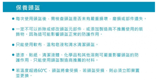 - 勿改裝設備 (如構造、顏色等)。護具若遭到污染、改造或誤用,可能會對效能造成危險的影響。
