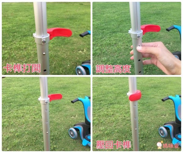 滑板車階段可以調整 90~120 公分的小朋友適玩,最後只要依照孩子們的身高調整為適合的高度即可。當然設計上調整也很方便,把卡榫打開 → 調整高度 → 壓回卡榫,完成!( ^ω^)