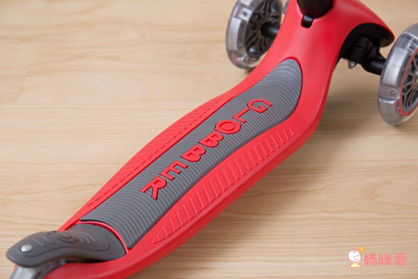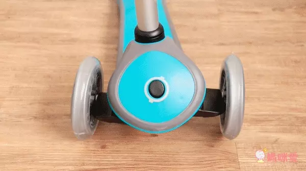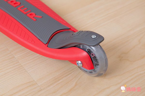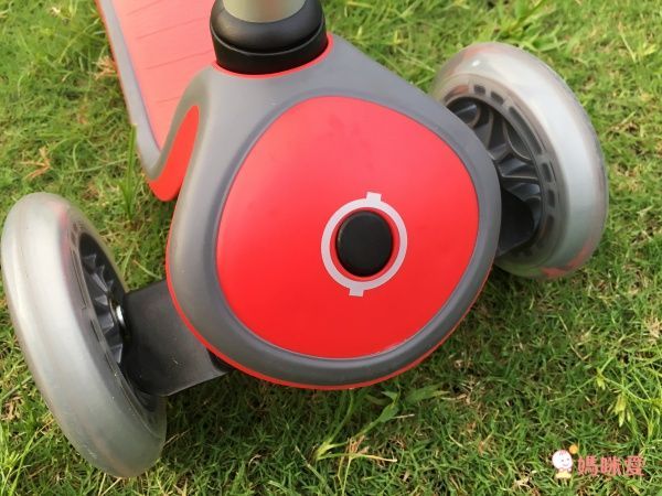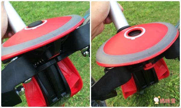 值得一提的是,globber 有個很棒的設計,這個按鈕是安全轉向鎖定鈕,可以固定滑板車前方的輪子。