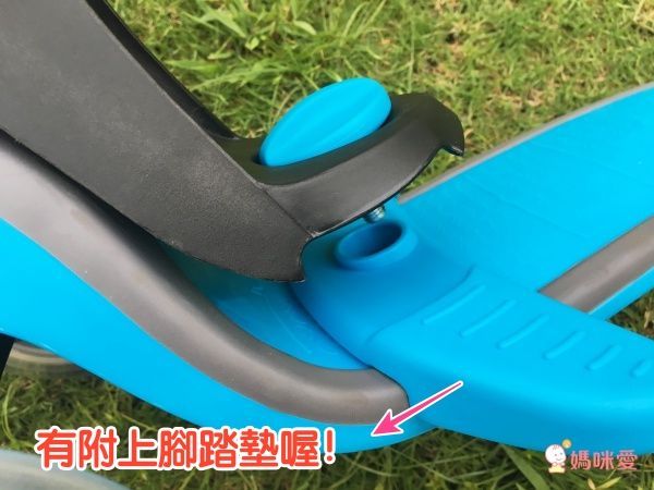 如果寶寶還小的話,可以放上內附腳踏墊,因為妹妹糖糖還不太會滑,所以我們有幫她裝上腳踏墊,這樣我們推她時,她的腳就有個棲息之處~但像牛牛會滑滑板車,其實就不需要腳踏墊,所以即使沒有裝,也是可以玩不會影響!