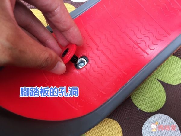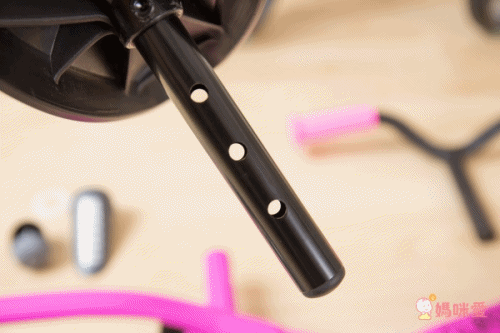 我先加上推桿,變身為最初階的第一、二階段,讓糖糖慢慢適應吧!只要「把紅色卡榫的部分,推到對應的洞裡」就完成了,組裝還滿方便的。