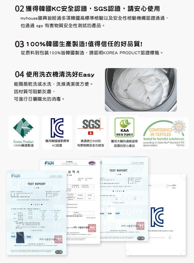 除了產地的保證,MYHOUSE 的防蟎睡袋還通過韓國KC認證、瑞士安全檢驗、SGS安全檢測、韓國抗敏協會認證等多項高標準檢驗,真正給寶貝最安心的守護!整組採用超細抗菌面料,能有效阻斷過敏原及有害物質,但仍然保持舒適透氣!經過實際測試,可有效減少99%以上的細菌產生!
