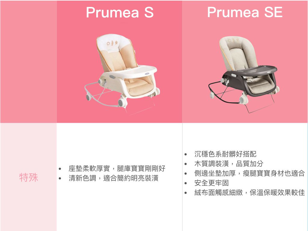 這邊整理了Prumea S跟Prumea SE的特色表格,給媽咪們參考一下喔,希望媽咪們都能買到適合自己寶貝的安撫餐搖椅(*´∀`)~♥