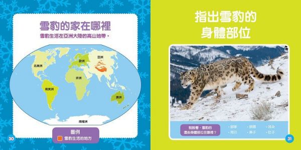 除了有很棒的描述之外,還有很棒的圖,《雪豹的冒險》其中一頁有世界地圖,不只讓孩子知道雪豹的家在哪,更讓孩子對地理有一個概念,還有一些問答的題目,和孩子互動,也讓孩子讀這本書是有趣又好玩的唷!