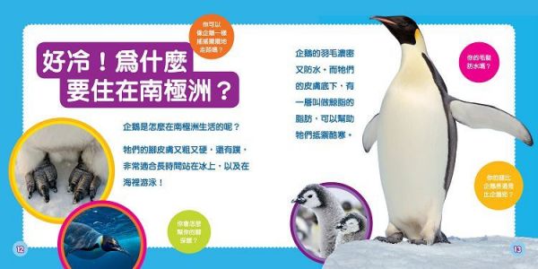 國家地理幼幼探險家一套有 6 冊,包含企鵝的冒險、無尾熊的冒險、蝴蝶的冒險、青蛙的冒險、雪豹的冒險及雲朵的冒險。全書印有精彩清晰的全彩圖片以有趣的問答方式介紹,內容包含動物的生活史、棲息地、習性、身體部位及特殊構造等等。