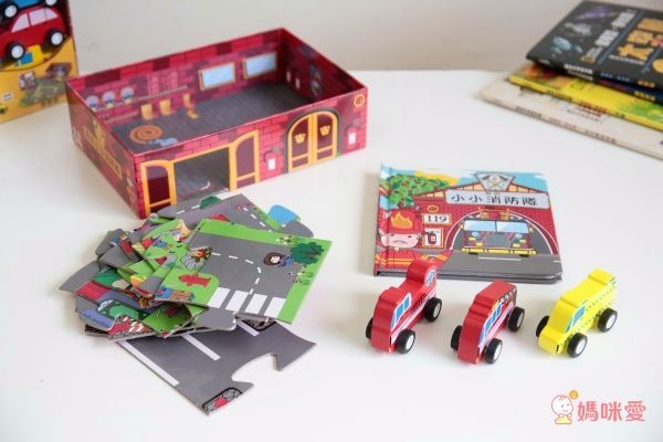 我的小小消防隊裡面有一本主題書、拼圖、三台車