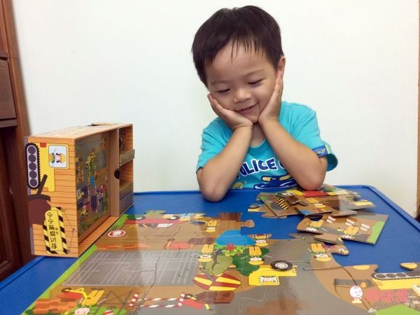 裡面還有拼圖組好的樣子可以讓小朋友對照,柚子很認真的在看拼圖要拼成什麼圖案,也很認真在比對!