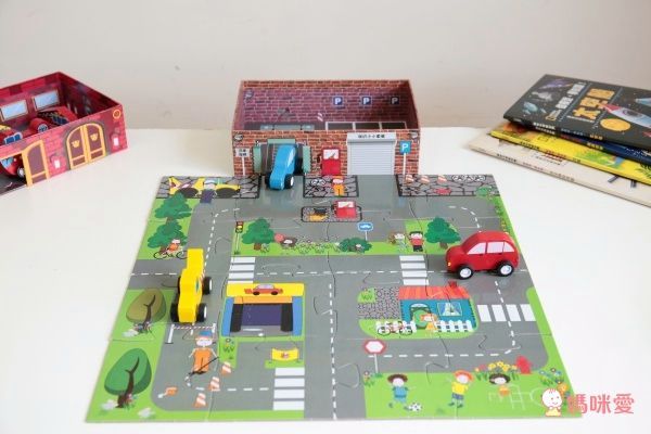 盒子裡面也是有圖案的,可以跟拼圖連成一組,裡面有三台車的停車場,可以把車子開進車庫裡面停好唷!