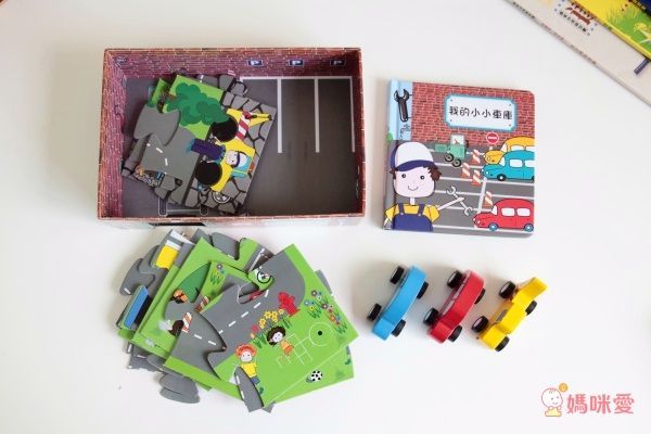 我的小小車庫裡有一本主題書、拼圖、3台車
