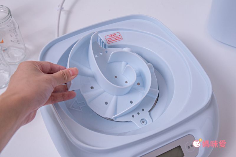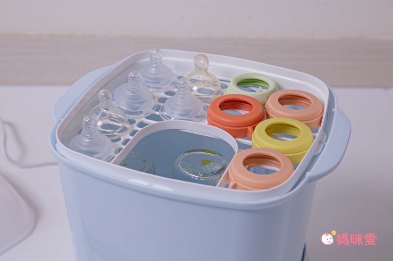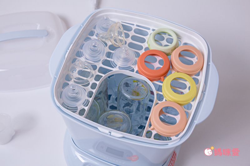 上方的小架子可以放奶嘴等較小的配件一同消毒烘乾~