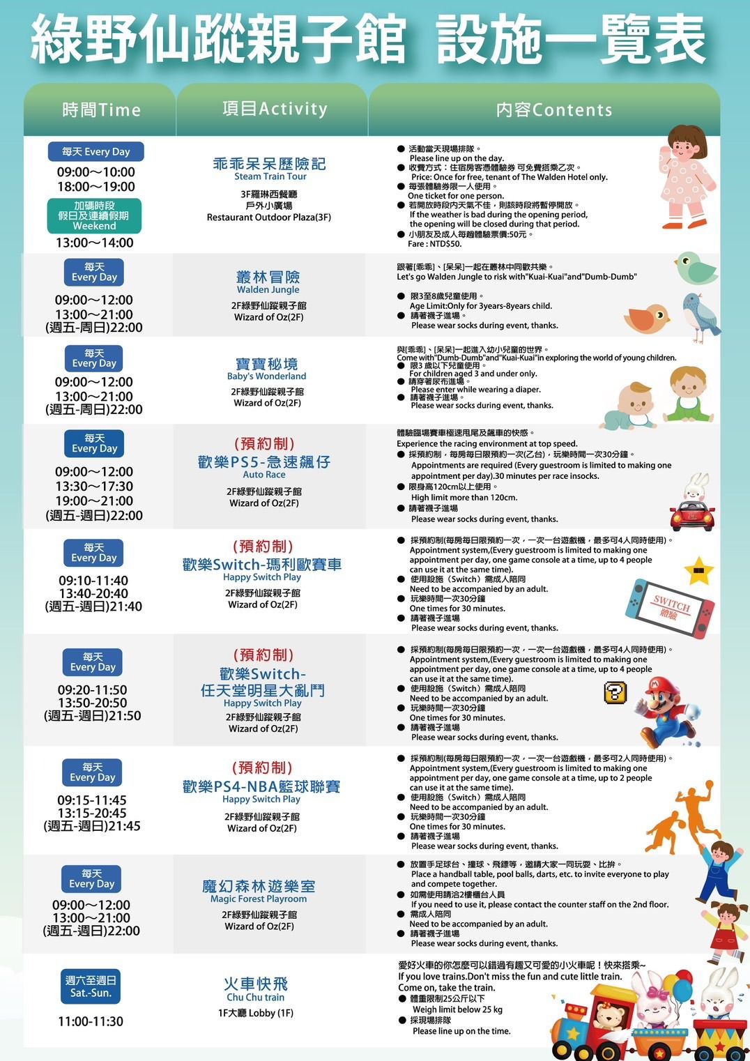 這密密麻麻的單子,就是親子館開放的所有設施和活動唷!媽咪可以在訂房時詢問,也可以入住後詢問櫃台人員。(每日活動表與親子館設施介紹可參考官網)