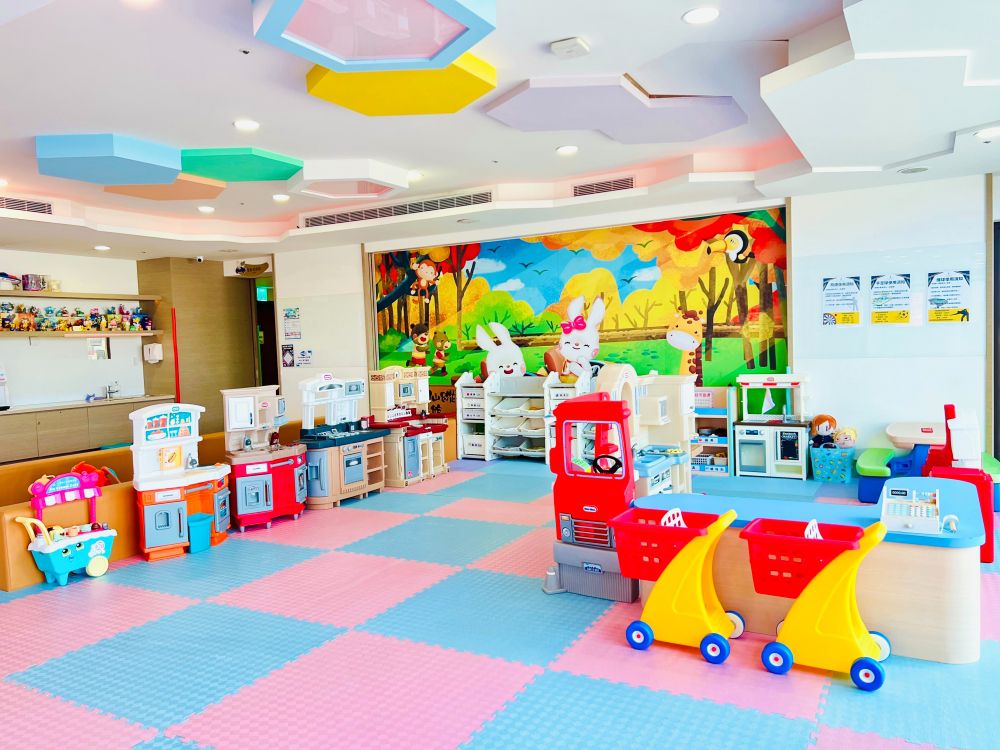 玩具、積木、絨毛娃娃、孩子們最愛的伴家家酒應有盡有,還有一面書牆讓家長們帶領孩子走進故事黃金屋