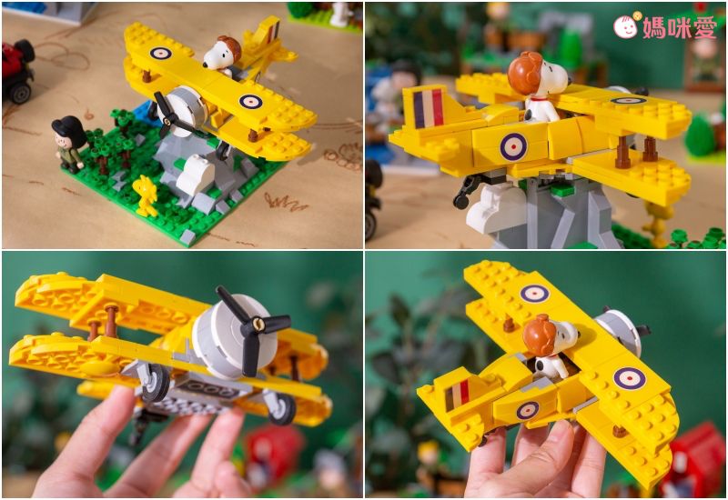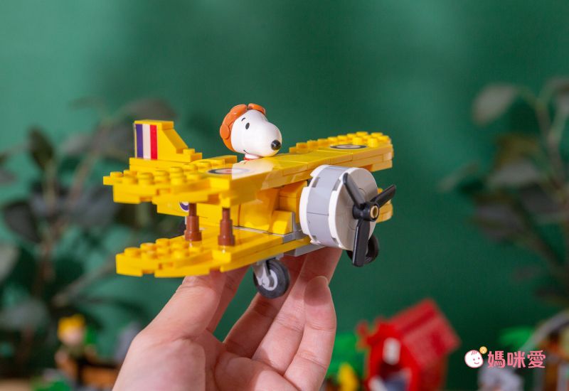 2. 尋寶飛機:這組是叢林系列裡顏色最亮眼的一組!飛機是陽光的金黃色,有可以停放的專屬停機架,史努比還戴上了護目鏡,準備起飛囉!孩子可以用手轉動前方的螺旋槳,就像真的在飛翔。