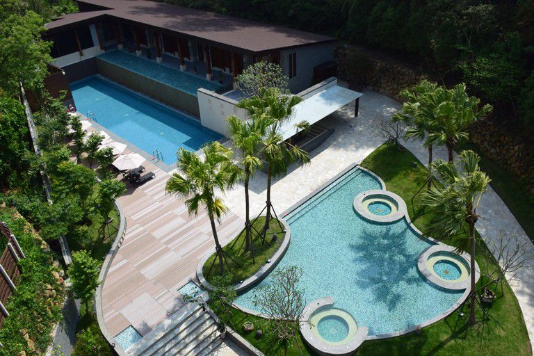 而往裡面走還有第二個方形泳池,位於湯屋區的下方,在山景繚繞下就像個秘境勝地。泳池周邊有販賣部、室外及室內的淋浴區、躺椅以及室外桌椅,就算不想下水游泳,夜晚時帶著茶點來這裡享受微風吹拂、欣賞美景邊聊天也是個不錯的選擇!