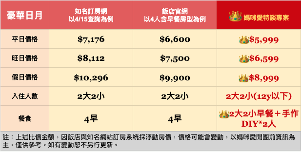 註:6歲以下或114cm以下幼童免費入住,7-11歲或115-155mc兒童,加價$800含早,大人12歲以上加價$1000含早。(費用現場收取)