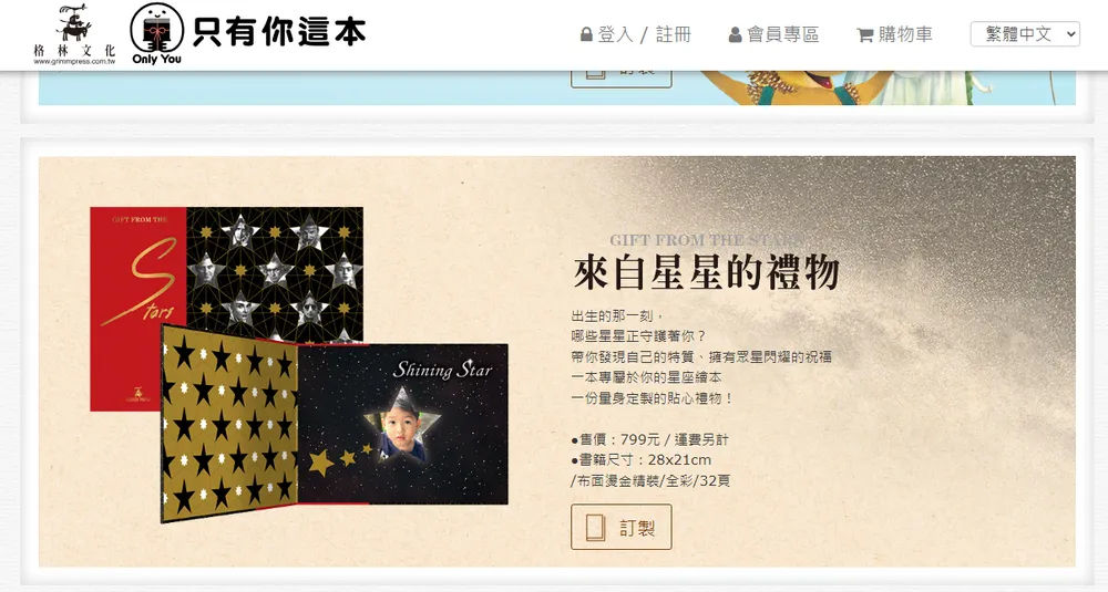 【預購團】 ・獨家優惠:2026/4/1~4/7購買生日書輸入折扣代碼【mml2604Qp】現折50元 出貨時間:點前往選購即可進入生日繪本訂製網站,開始為您的寶貝客製『Only You只有你這本生日書』!客製化繪本採數位印刷和手工裝訂,加上製作完畢後仍需要進行人工檢查,一本書的製程較長,須等待 14 個工作天到貨喔(恕無法指定時間),為了確保媽咪和寶貝們可以準時地收到生日書,建議提早訂製會最保險唷!(訂製化商品恕無法接受取消,盼媽咪體諒,謝謝!) |