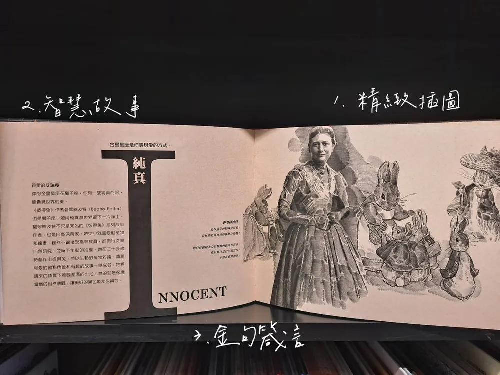 甚至每頁星座指引還會對應該星座名人的小故事與經典金句,有愛因斯坦、米開朗基羅、歐普拉等古今名人來詮釋我們的星座特質!