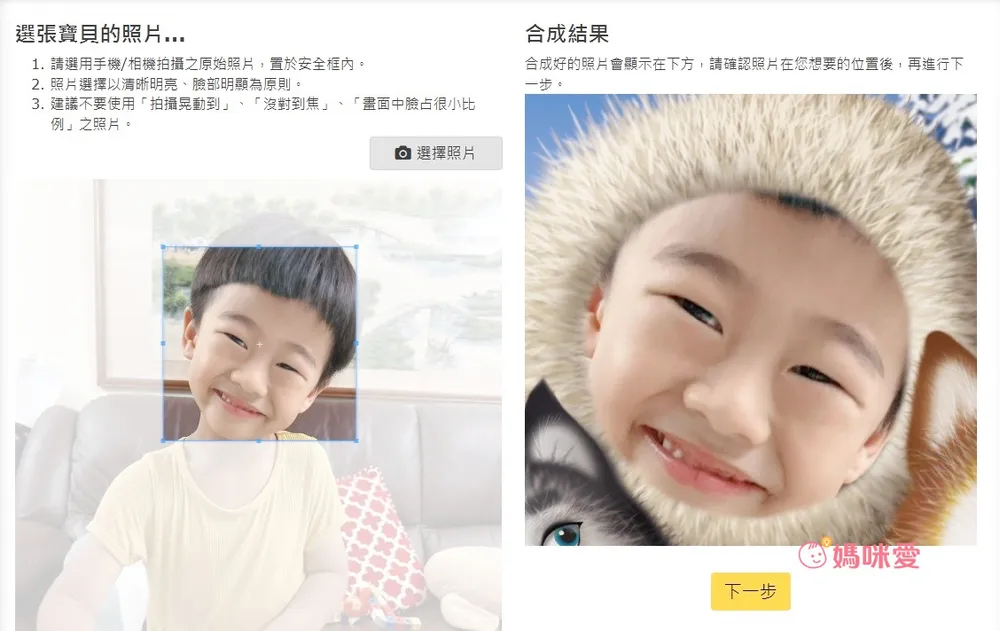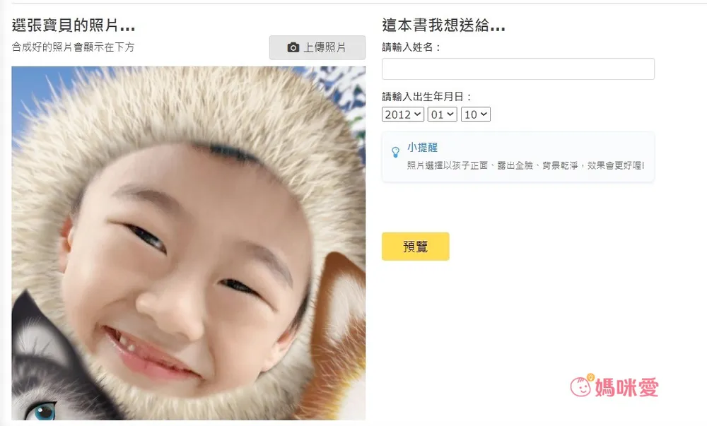 step 1.按下上傳照片後,會跳轉至新頁面,選張寶貝的萌照(至少 2MB 以上以確保印刷品質,臉部清晰不模糊,照片明亮無背光!)上傳後,將頭部置於圓型安全框內,選好照片按下合成,可以直接預覽到合成結果,確定沒問題之後點擊下一步跳回輸入資訊畫面。右邊則填入想要出現在書上的寶貝名字等資訊,完成後即可按下預覽。