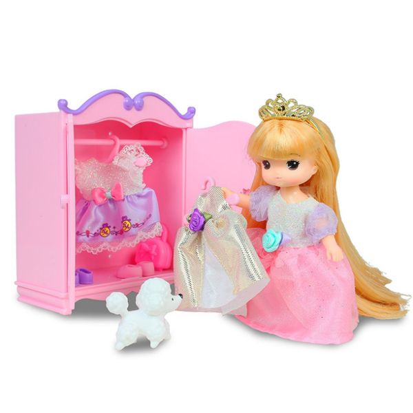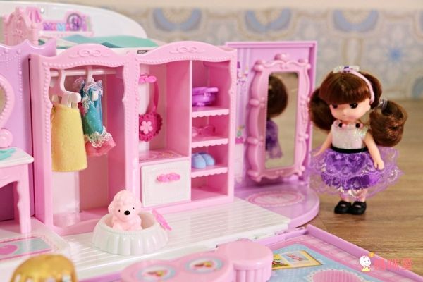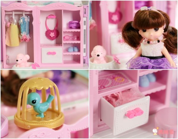 仔細看它的細節設計都非常用心,既然這款 MIMI 娃娃住的是 “豪宅” 自然洋裝也不能馬虎啦~!娃娃穿的是亮亮蕾絲紗裙,而且衣櫃裡有 4 套衣服、2 雙鞋子、2 個包包可以換裝唷!(她還養了一隻粉紅色的貴賓狗和小鸚鵡呢~)