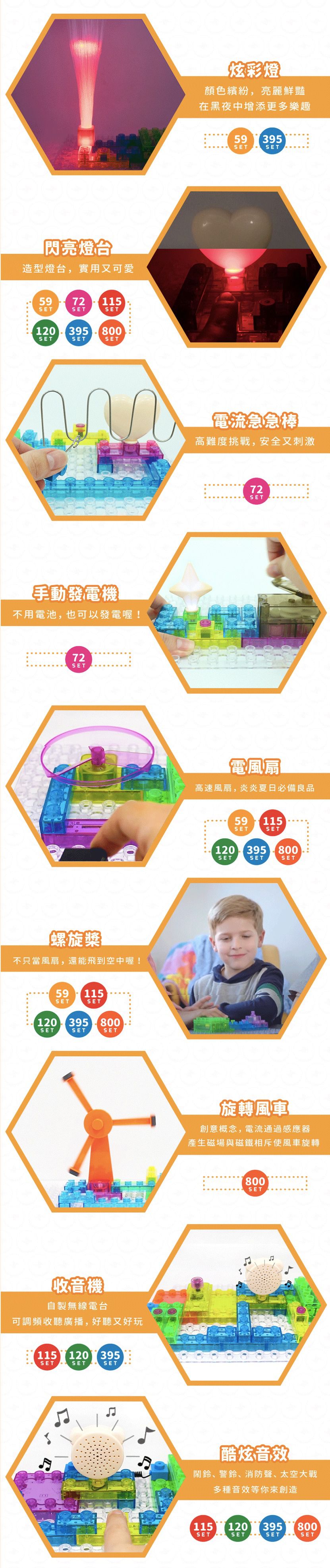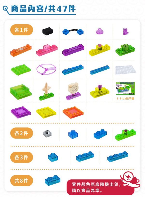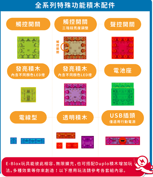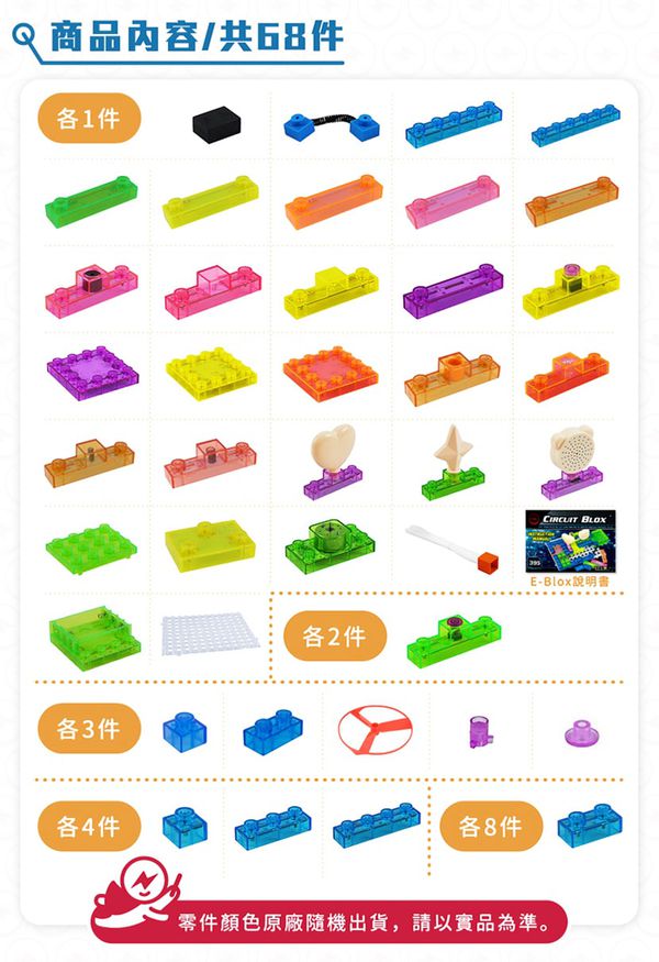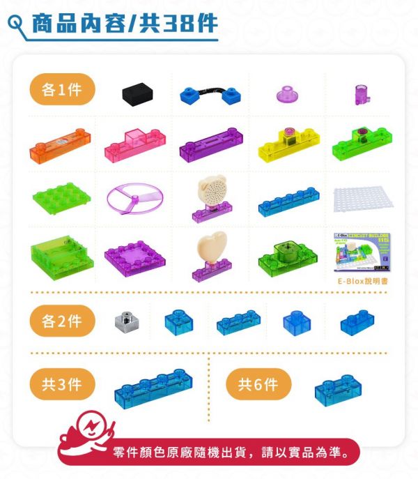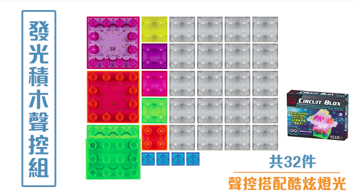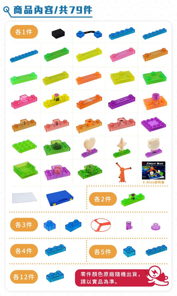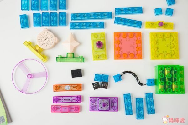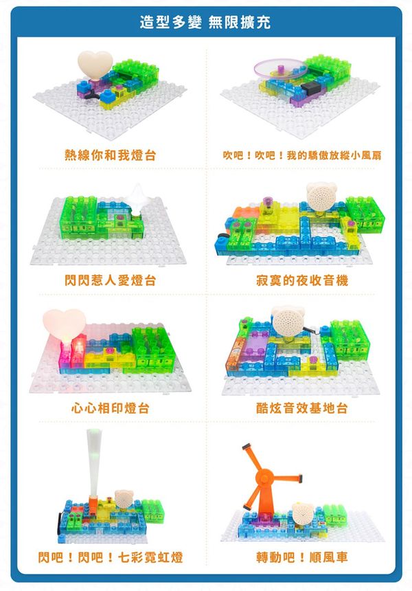 積木配件種類有:透明基座、電池盒、1-6 格的藍色連結區塊、彈簧線連結區塊、各式開關、喇叭、燈、LED、扇葉片、發動機、音量調節器、功率放大器、三合一板、觸控板、FM收音機板等。