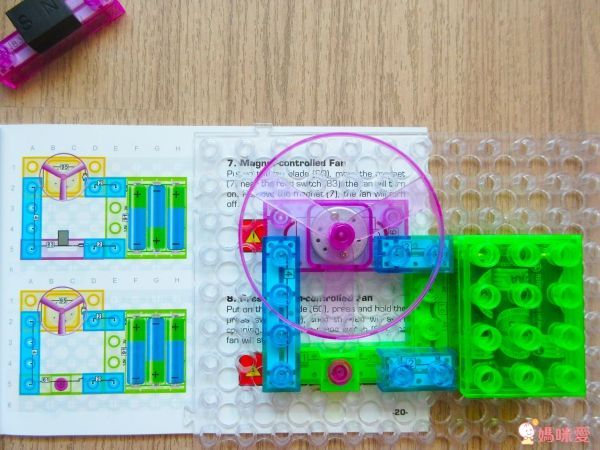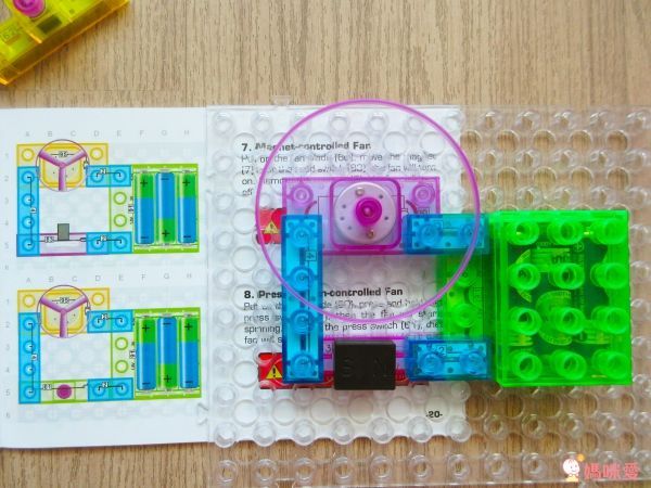 這個挺好玩的,剛好是酷暑的夏天,相信很多小朋友都有自己開電風扇開關的經驗,這就是電風扇的邏輯電路設計!NO.95 是發動機,再裝上扇葉片,啟動 NO.62 開關鍵即有涼涼的風可以吹囉!