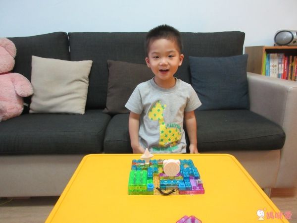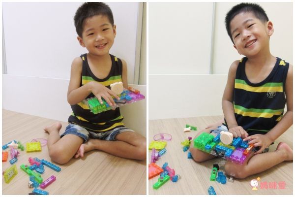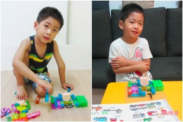 其實只有鏡頭的前半段是標準的積木會唱歌的組法,靠近弟弟的部分,是他自己練習組裝的擴充場地(只要線路有接好,其他地方不影響播放唷!),讓他練就手能生巧的大小肌肉,不用擔心太小不會組,反正就拼拼湊湊也是一種專注力的培養唷!
