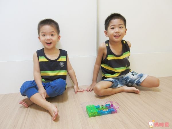 按下去之後,他們兩個呼喊:媽咪妳看!積木燈跟 LED 燈都亮了 d(d'∀')