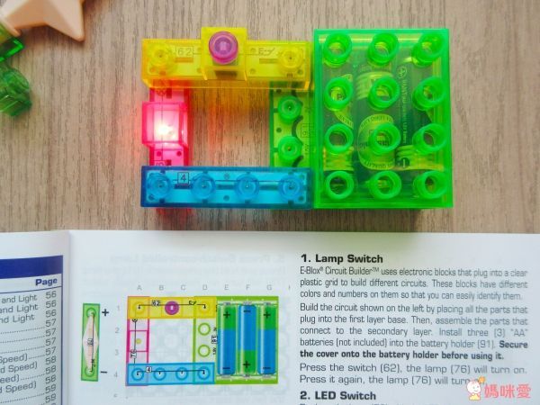 玩的同時可教孩子明白簡單的邏輯,從電池盒接出來有正負極,要讓燈亮需要正負極都導通,一極是接帶有開關的連接器,另一極直接是連接器,再按NO.62開關鍵即一按開再按關的簡單道理囉!
