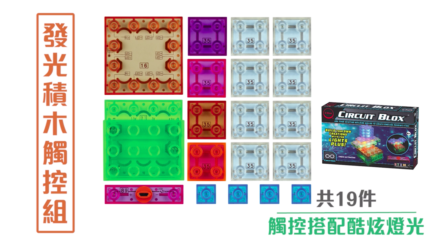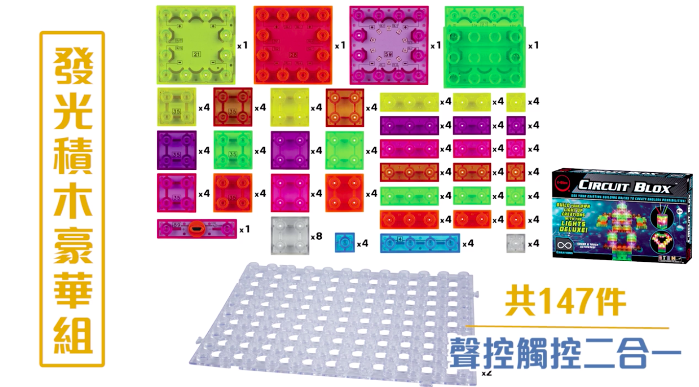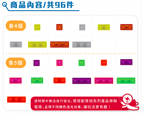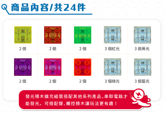 總共有24塊不同LED顏色的發光積木,可以和豪華組、觸控組、聲控組共玩喔!越多發亮積木可以變出更多閃亮作品