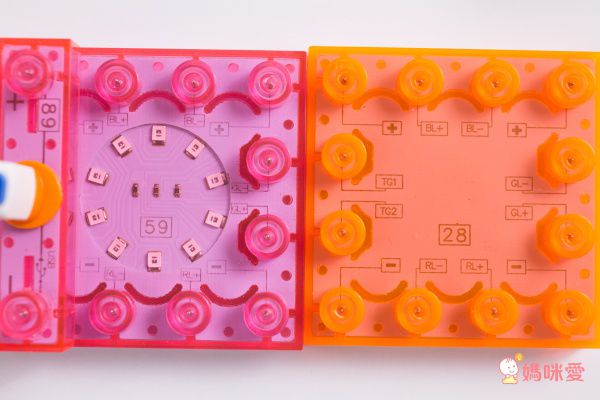 上面有數字編號59的是發亮積木(粉紅),內含不同顏色的LED燈,而編號28是聲控積木(橘色),就靠它來控制聲音反應!編號21是觸控開關積木(黃色),還有小顆的發亮積木,以及一些透明積木