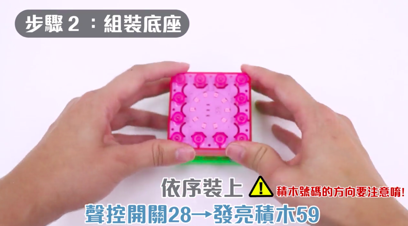 組裝聲控積木最重要的就是聲控積木和發亮積木的方向要裝對喔!裝對才會發亮