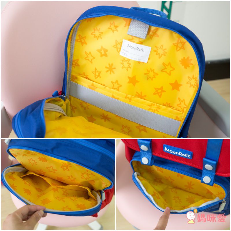 內側縫有布標,可以寫上小朋友的姓名、電話。課本、參考書可以放在靠近背部內隔的空間,再調整鬆緊帶固定,讓比較重的書本不會晃來晃去!也有放鉛筆盒和文具的空間唷!(小技巧:最重的物品可以靠最裡面鬆緊帶放,也就是最貼近小朋友背部的位置,這樣可以讓書包背起來更穩、更省力唷!)