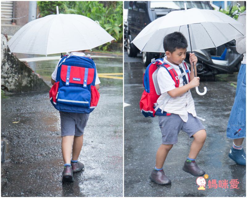 下雨了,舊款還必須再套上一層書包雨衣,MR3 S的外層有做鐵氟龍塗層讓寶貝可以直接撐把傘就安心出門!就算淋到雨水也一下就滑落,不會弄濕。安安實際背出去,撐傘就算後面不小心沒撐到,書包也抖一下就乾了耶!不怕裡面的東西濕掉,超方便!